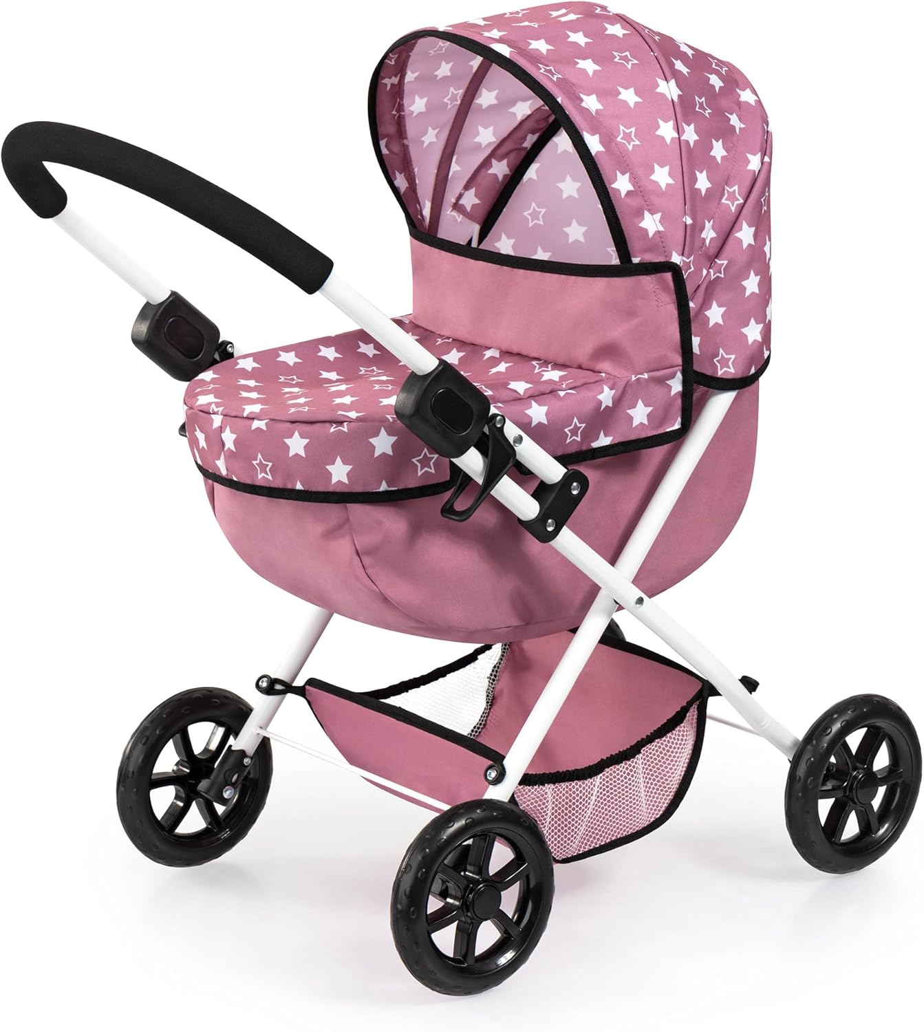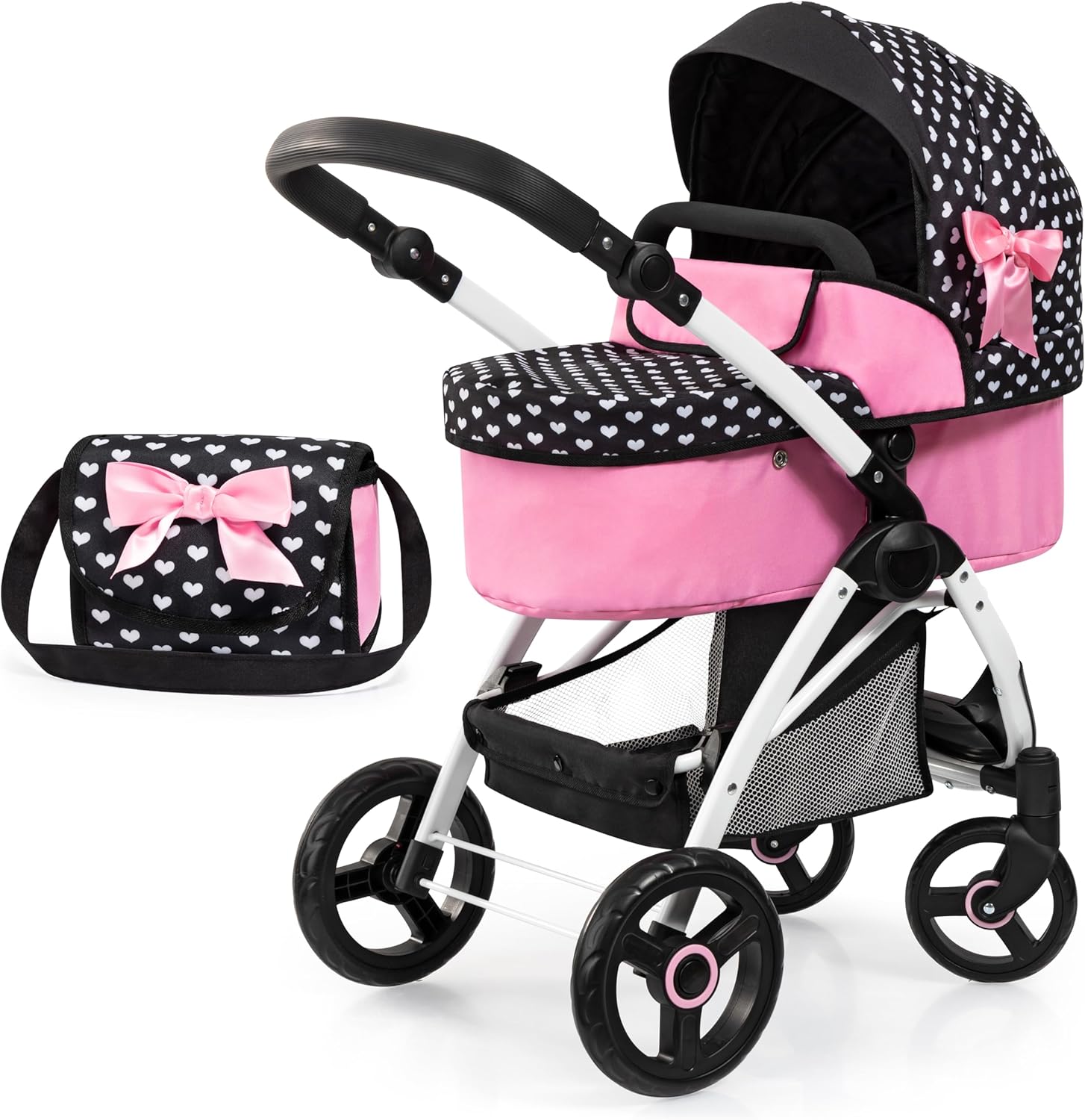 SHOPPULSE Puppenwagen City Max mit Tasche, höhenverstellbar, schwenkbare Vorderräder, wandelbar als Jogger, integrierter Korb, Schwarz, Rosa