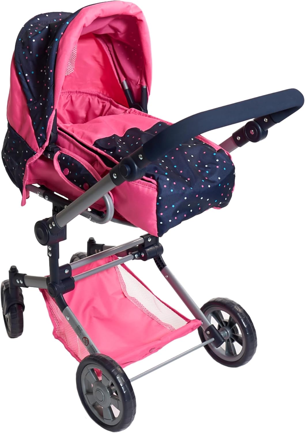 SHOPPULSE 3in1 Kombi Puppenwagen Jara – Konfetti Pink – faltbar, höhenverstellbarer Griff 47-78 cm – Tragetasche – Puppen bis 52 cm, 4-8 J.
