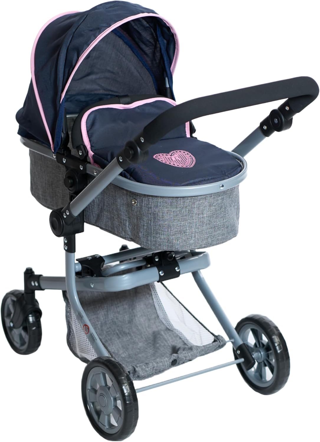 SHOPPULSE 2in1 Puppenwagen Mika – Melange Grau Navy – faltbar – höhenverstellbarer Griff 47-80 cm – modernes Gestell – Puppen bis 52 cm – 4-8 J.