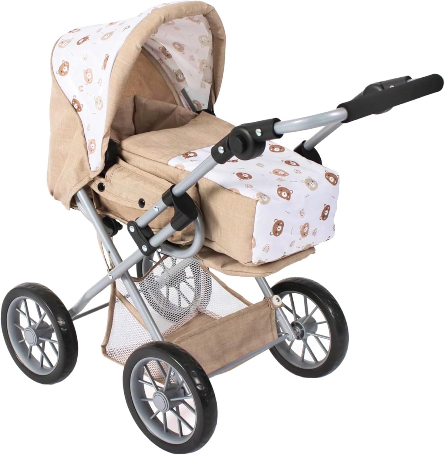SHOPPULSE 3in1 Kombi Puppenwagen Leni - Bärchen Beige - faltbar, höhenverstellbarer Griff 43-67 cm, Tragetasche – Puppen bis 46 cm, ab 3 J.