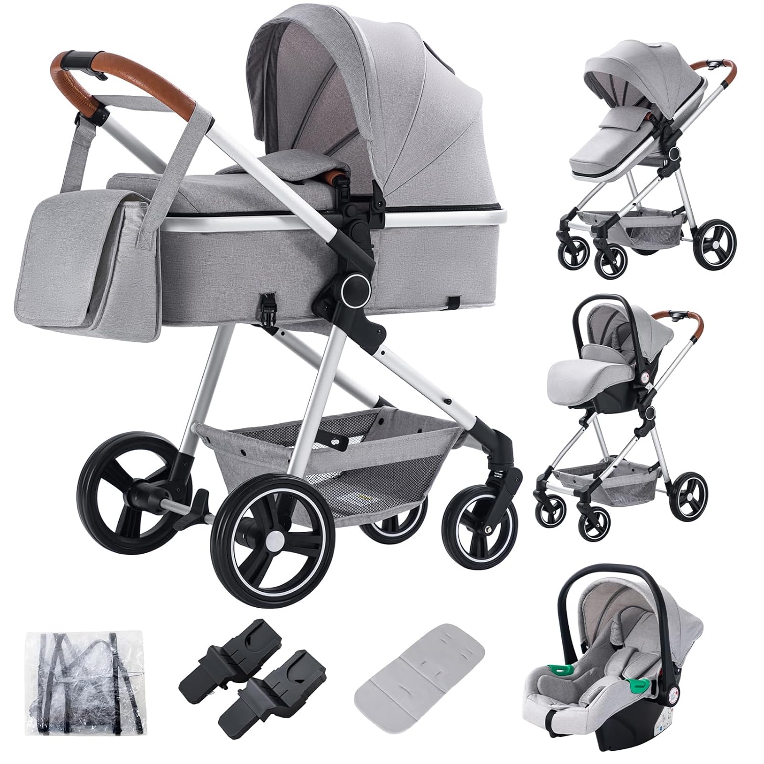 SHOPPULSE PU-Leder Kinderwagen 3 in 1, Kinderwagen mit Umkehrbarem Doppelschiebemodus, Buggy Großer Bequemer Babywanne, Kombikinderwagen 3 in 1 Rahmen Aluminiumlegierung Faltbar Hohe Landschaft (518 Grey)