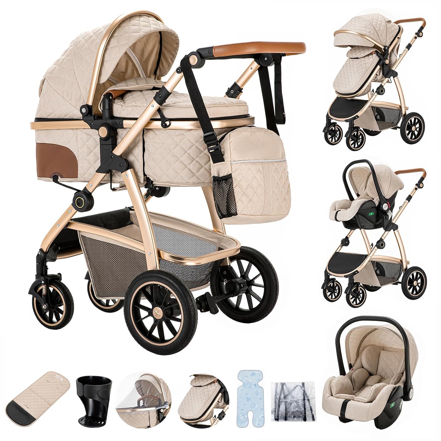 SHOPPULSE 3-in-1 Kinderwagen KombiKinderwagen-Set 2-in-1 Buggy faltbar Luxus Hochlandschaft Neugeborenes Tragbarer Kinderwagen Zusammenklappbarer Kinderwagen Kinderwagen Travel System (D2-RICEWHITE)