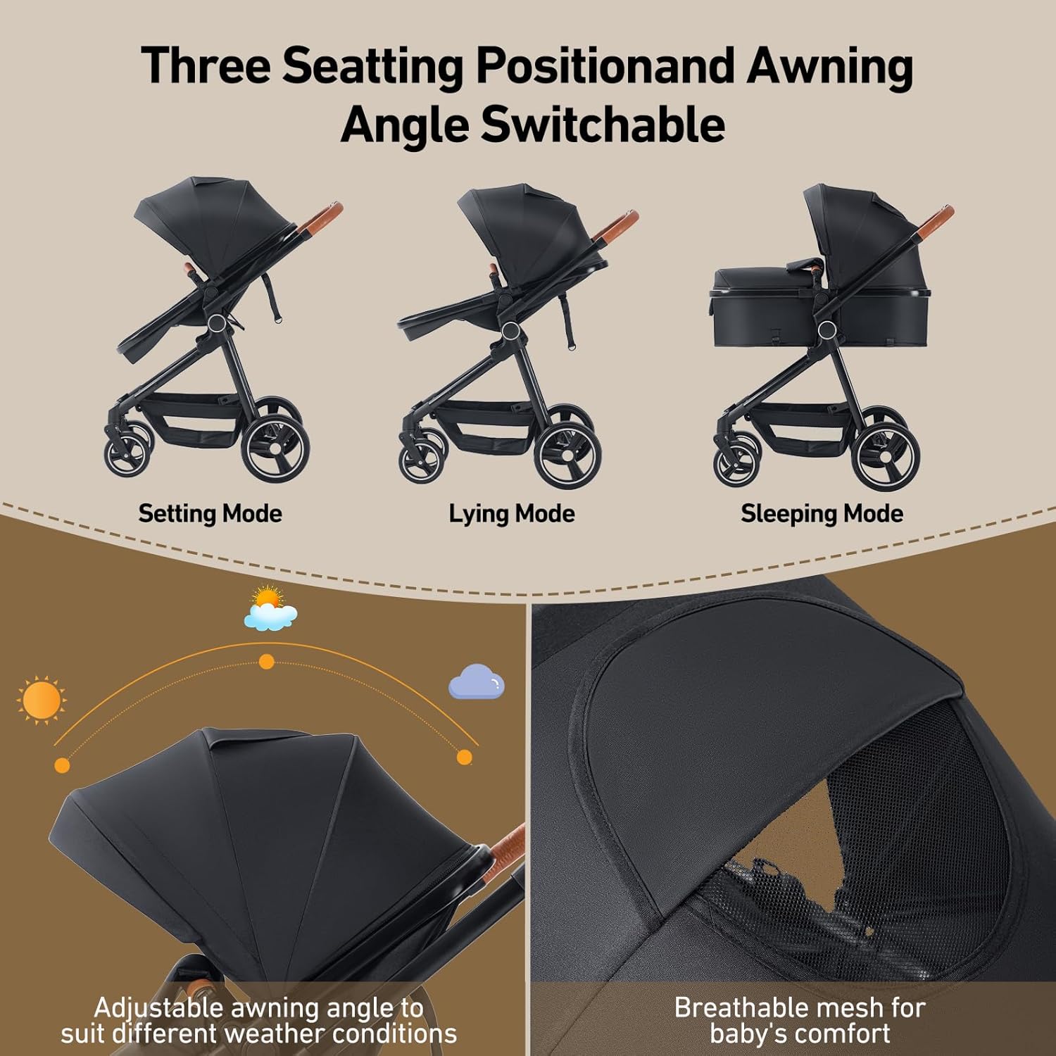 【Großer Stauraum und Vielseitigkeit für alle Jahreszeiten】Der Kinderwagen ist mit einem Aufbewahrungskorb mit großer Kapazität ausgestattet. Das Verdeck des Kinderwagens kann eingestellt werden, um sich dem Sonnenlicht anzupassen. Die Lüftungsöffnungen